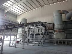 由常州市范群干燥設備有限公司生產的2萬噸/年白碳黑干燥裝置日前在浙江橫店通過驗收,該裝置由燃煤熱風系統、加料系統、閃蒸干燥系統、布袋收塵系統、自動包裝系統等組成。針對白碳黑濾餅含水量高、耐溫高及產品比重小的特點,熱源采用了間接式燃煤熱風爐,熱風溫度高達500℃以上,進料系統采用皮帶輸送和螺旋加料相結合,干燥主機采用直徑2米的閃蒸干燥機,直接配套布袋除塵器收集產品,并由自動包裝機完成產品包裝。整套裝置自動化程度高,在人員配置及噸耗等重要指標達到了設計水平。