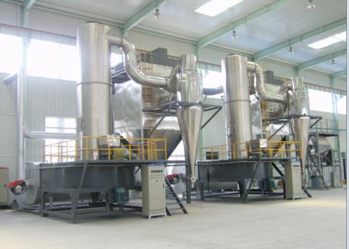 閃蒸干燥機(jī)主要由進(jìn)風(fēng)系統(tǒng)、加熱系統(tǒng)、加料系統(tǒng)、干燥主機(jī)、收料除塵系統(tǒng)、排風(fēng)系統(tǒng)、控制系統(tǒng)等組成。工作時(shí),濕物料由螺旋加料器進(jìn)入干燥室,物料在干燥室中與高速旋轉(zhuǎn)的熱風(fēng)相遇,細(xì)粉狀物料被熱風(fēng)帶著向干燥室上端移動(dòng),不能帶走的物料落在干燥室底部,被底部的粉碎裝置打碎,物料被迅速分散,物料與熱風(fēng)的接觸面積迅速增大。在離心力的作用下(頂部有分級(jí)裝置),達(dá)到一定干燥程度和細(xì)度的產(chǎn)品被吹出分級(jí)裝置,物料在此過程中得到快速干燥。