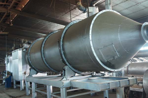 工業烘干設備屬于礦山機械,一般多為大、中型機械,其熱源來自燃燒裝置,采用順流式加熱方式。因此需要烘干的物料,從進料箱、進料溜進入筒體,即被螺旋抄板推向后。由于烘干機傾斜放置,物料一方面在重力和回轉作用下流向后端,另一方面物料被抄板反復抄起,帶至上端再不斷地揚撒下來,使物料在筒內形成均勻的幕簾,充分與筒內的熱氣流進行熱交換,由于物料反復揚撒,所含的水分逐漸被烘干,從而達到烘干的目的。